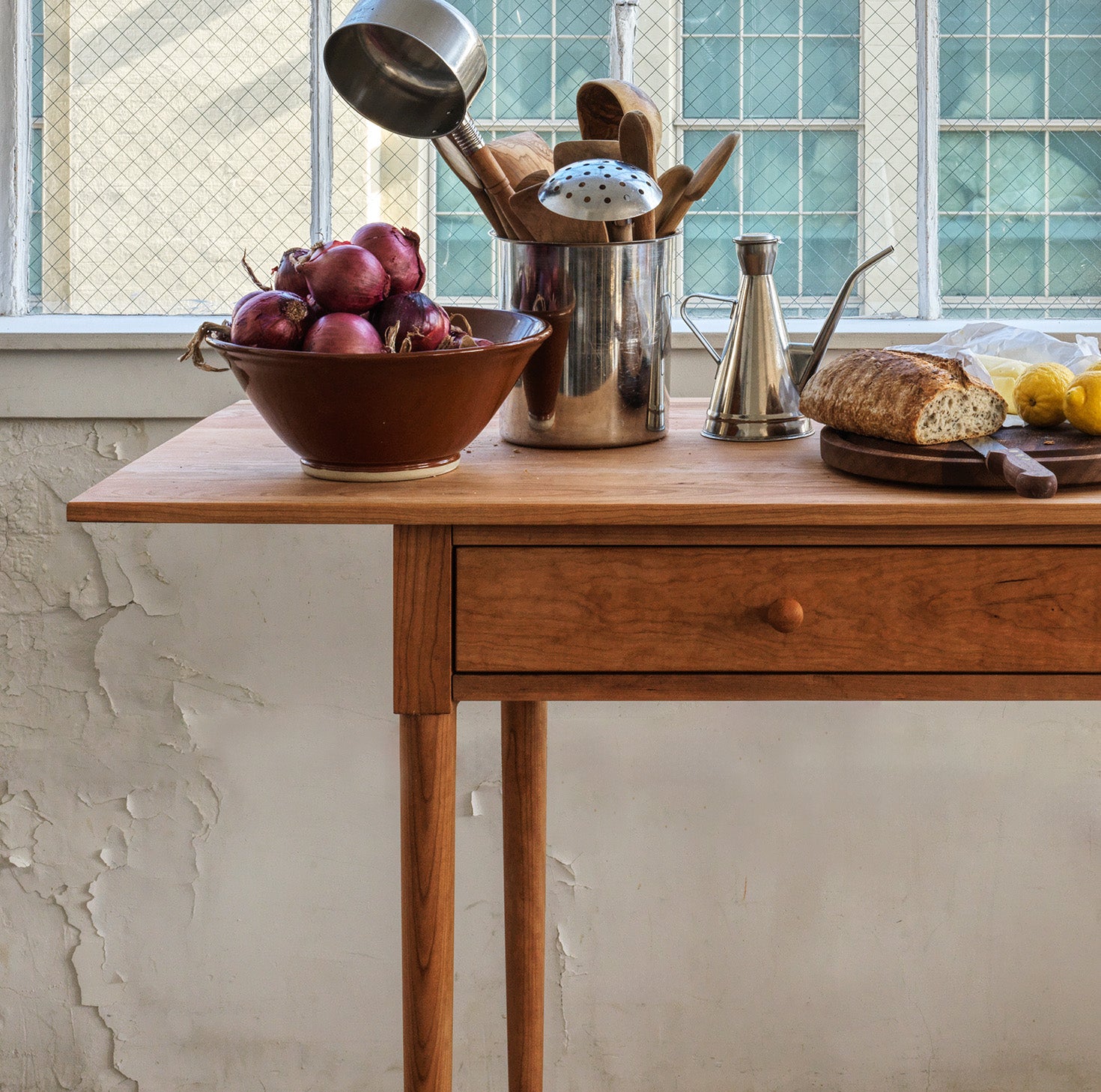 shop nowHard-working kitchen island, ready for food prep or hosting, with optional wooden casters. Made from solid American Cherry and finished with hand-rubbed Tung oil.