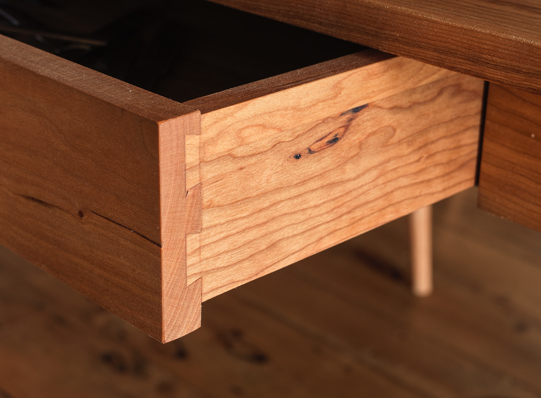 Cherry wood starts light and darkens significantly in the first three months. From months 3 to 12, the darkening slows, reaching a deep, rich tone with red undertones. Walnut starts as a deep brown and gradually lightens over time. In the first three months walnut’s tone becomes warmer and lighter. From months 3 to 6, the change slows as it settles into a medium brown with golden or amber tones. In our opinion, the mature tones of both woods are preferable to the initial ones.