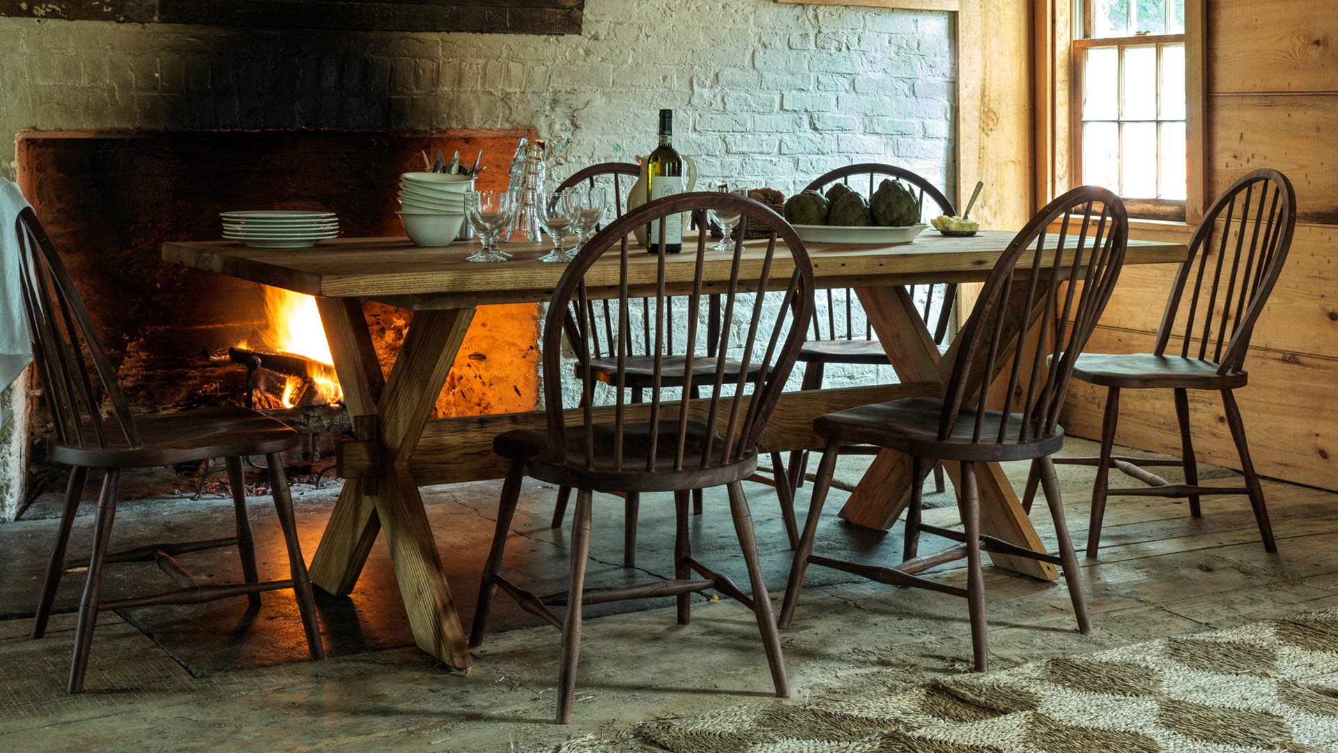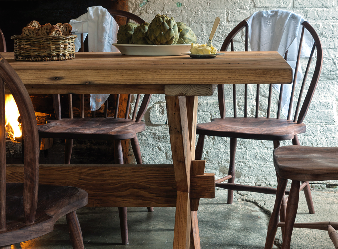 The chestnut boards used in the table are cut from reclaimed barn posts in Ohio. Nail holes, checking, mineral deposits and some signs of insect activity are part of the appeal of the table.