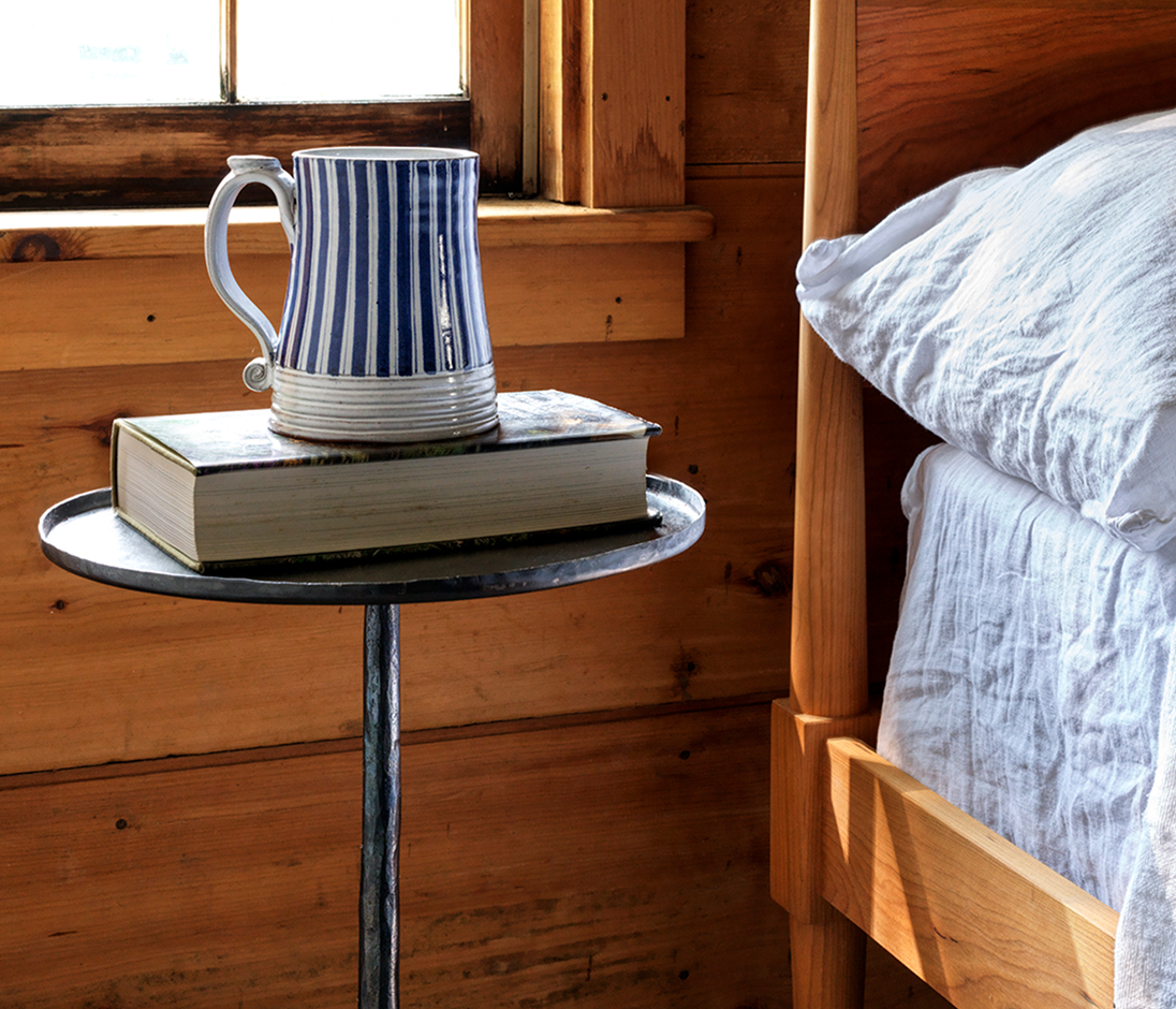 Hand-forged in Maine, by Matt Foster and the Black Dog Ironworks team, our Martini table was designed for our tavern, Stissing House, in Pine Plains, NY. Inspired by an 18th century table at the Henry Francis du Pont Winterthur museum, it functions as its namesake, an elegant side table, or even as a nightstand. Forged in 1800 degree heat, then worked with hammer and anvil, each table is born unique with over five hundred strikes to make the final shape. Finished in linseed oil, you’ll notice the beautiful variations on its surfaces and facets. With an eleven and a half inch diameter, and a twenty-six inch height, the table is sturdy, versatile, and should last forever.