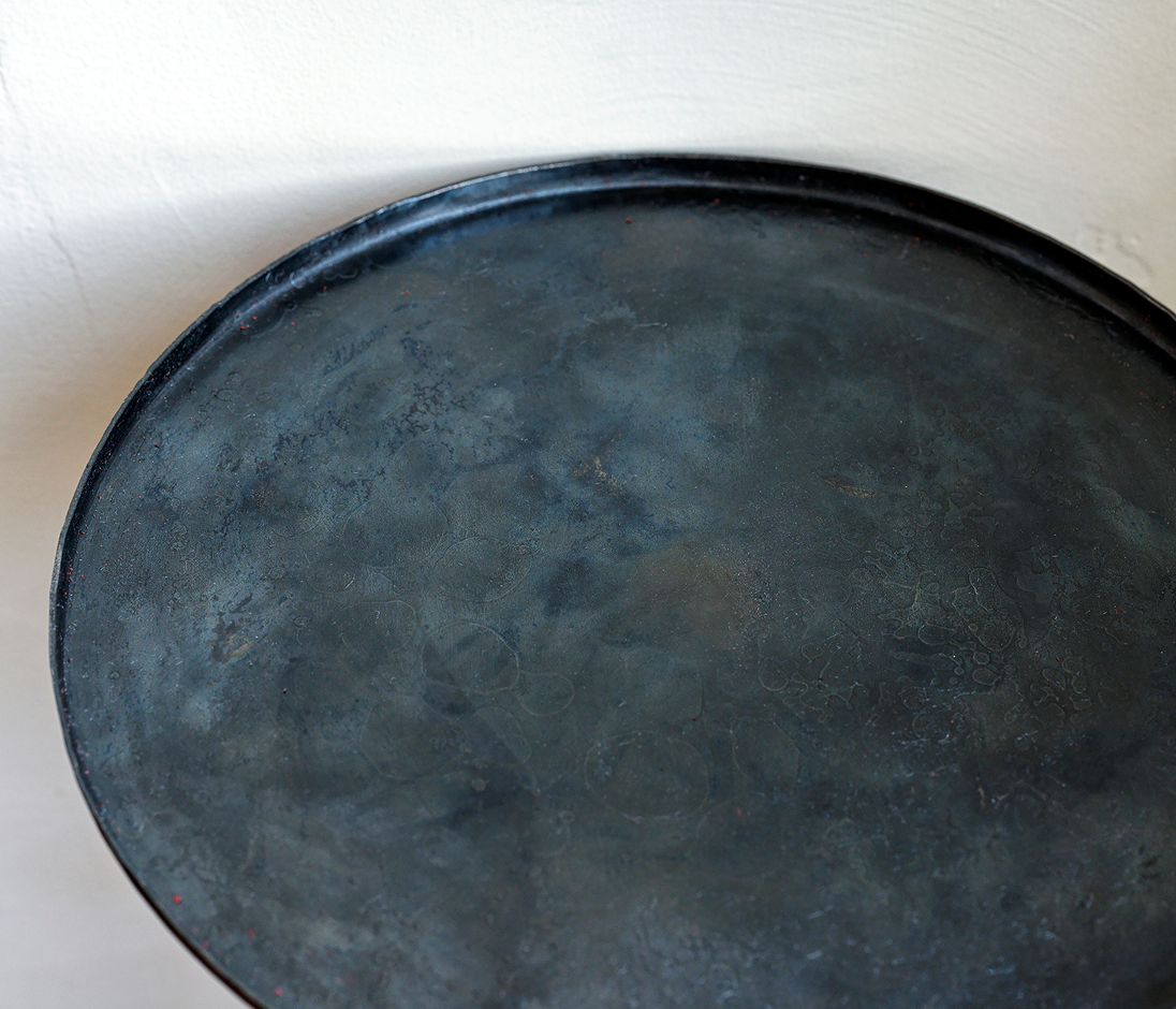 black oxide bath, then raw linseed oil rubEach table undergoes a black oxide bath, resulting in a beautiful, inert, and corrosion-resistant finish. It is then treated with raw linseed oil, initiating the patina formation process.