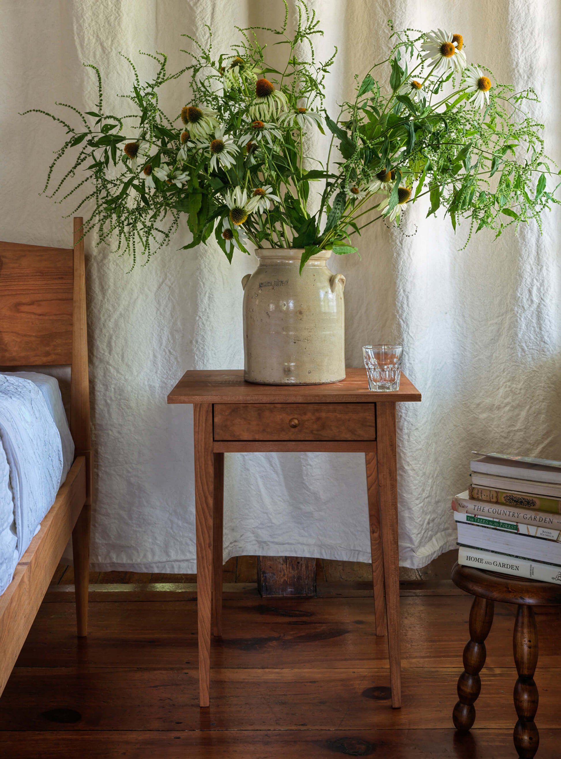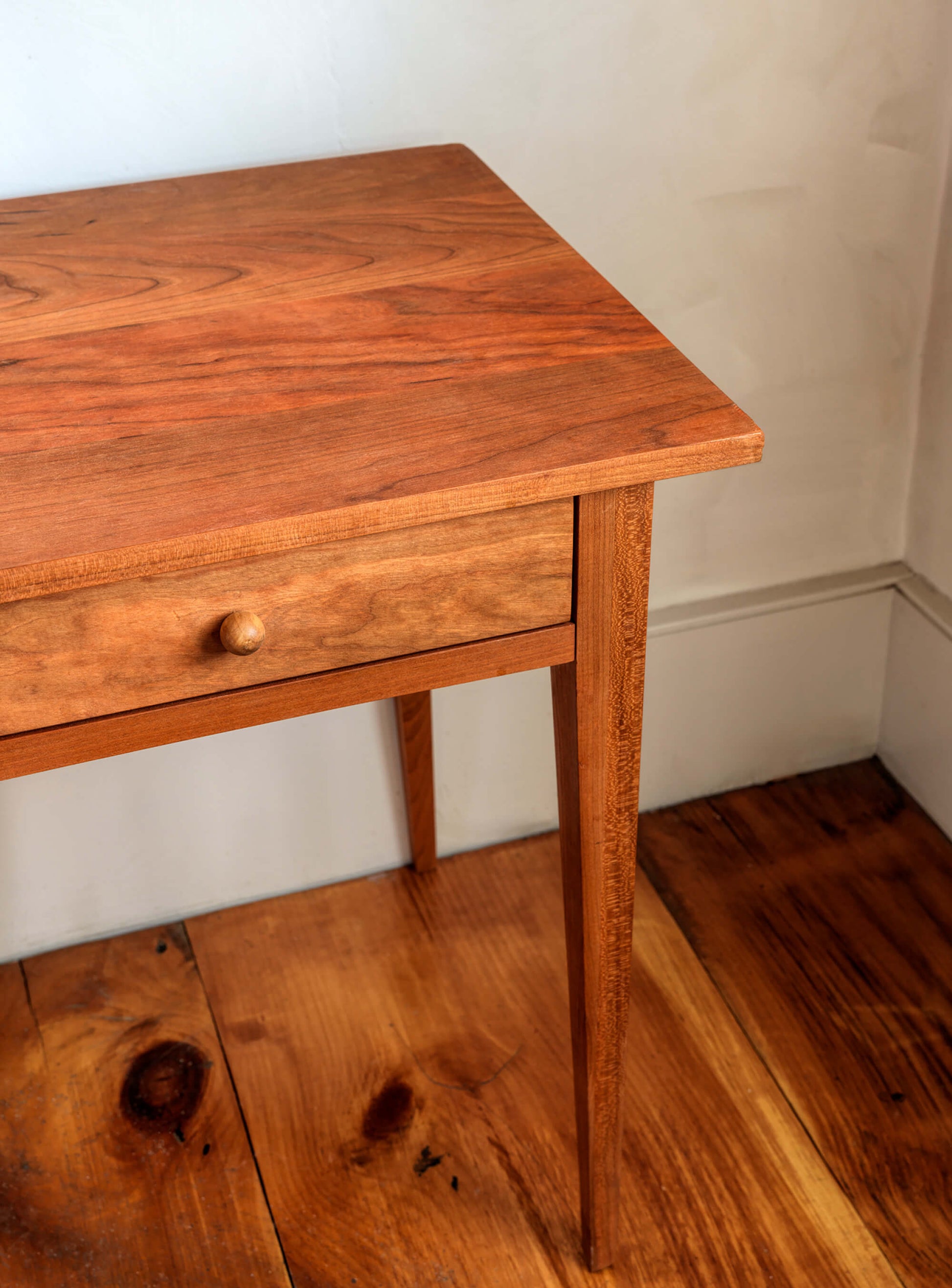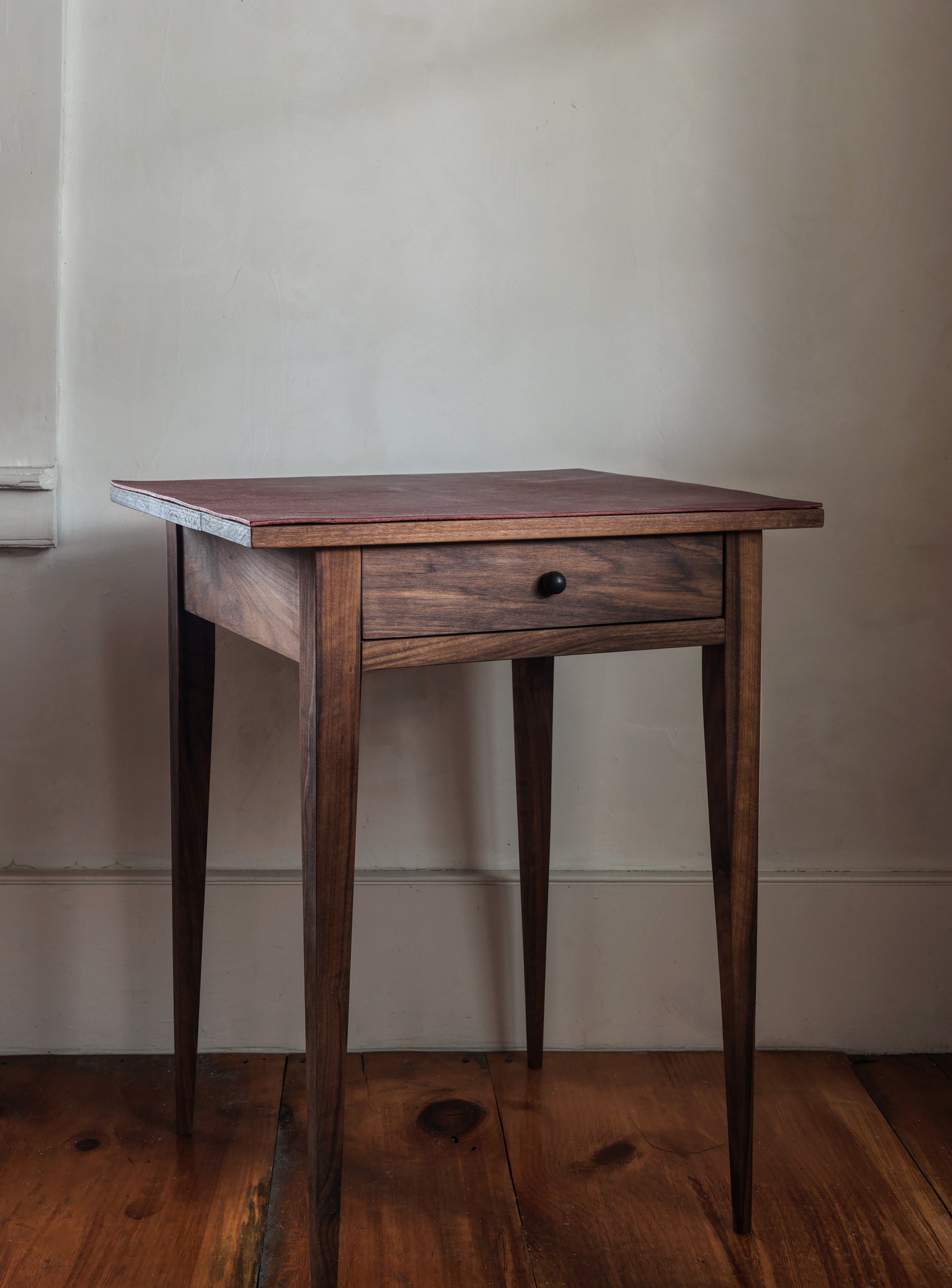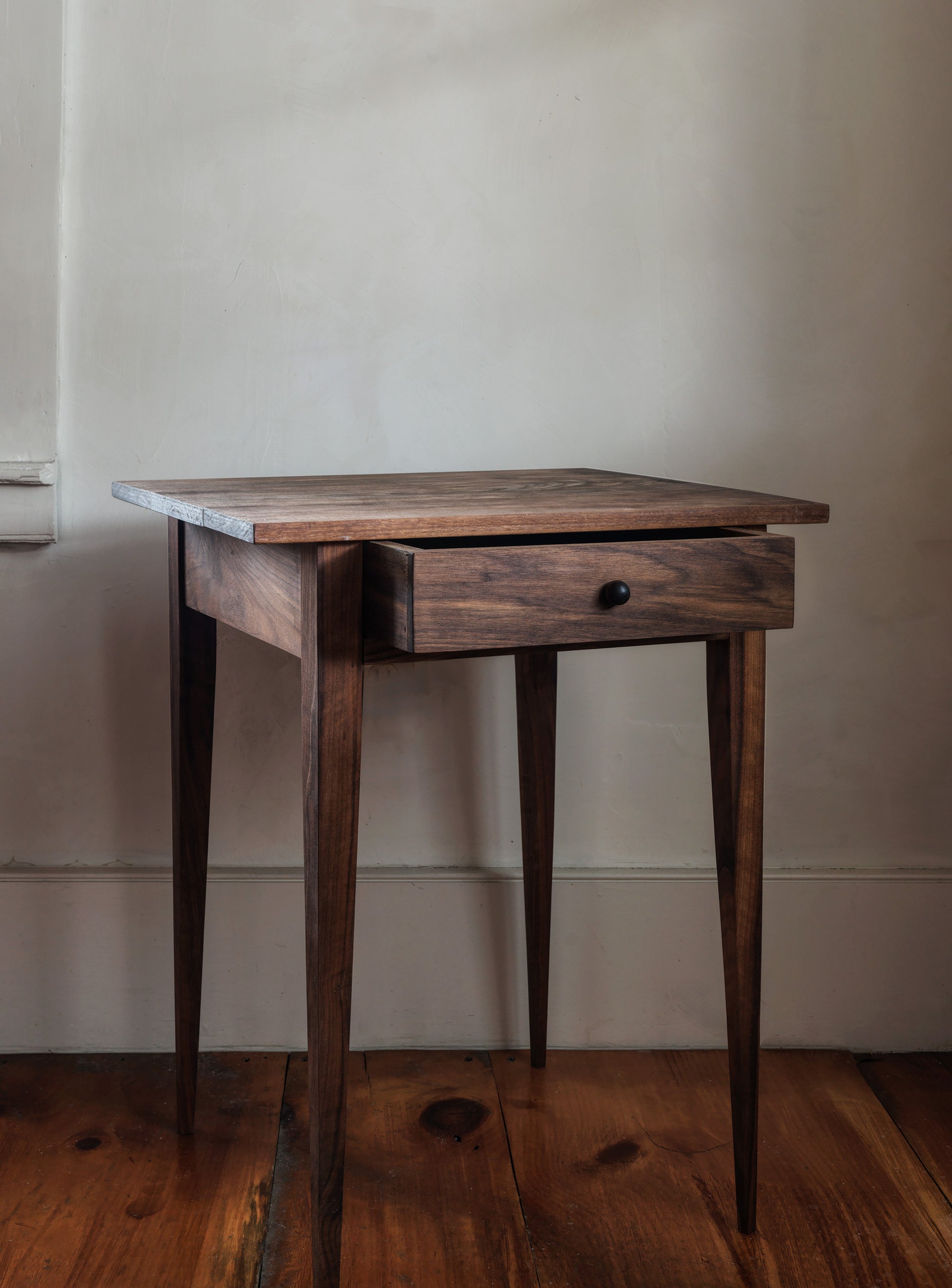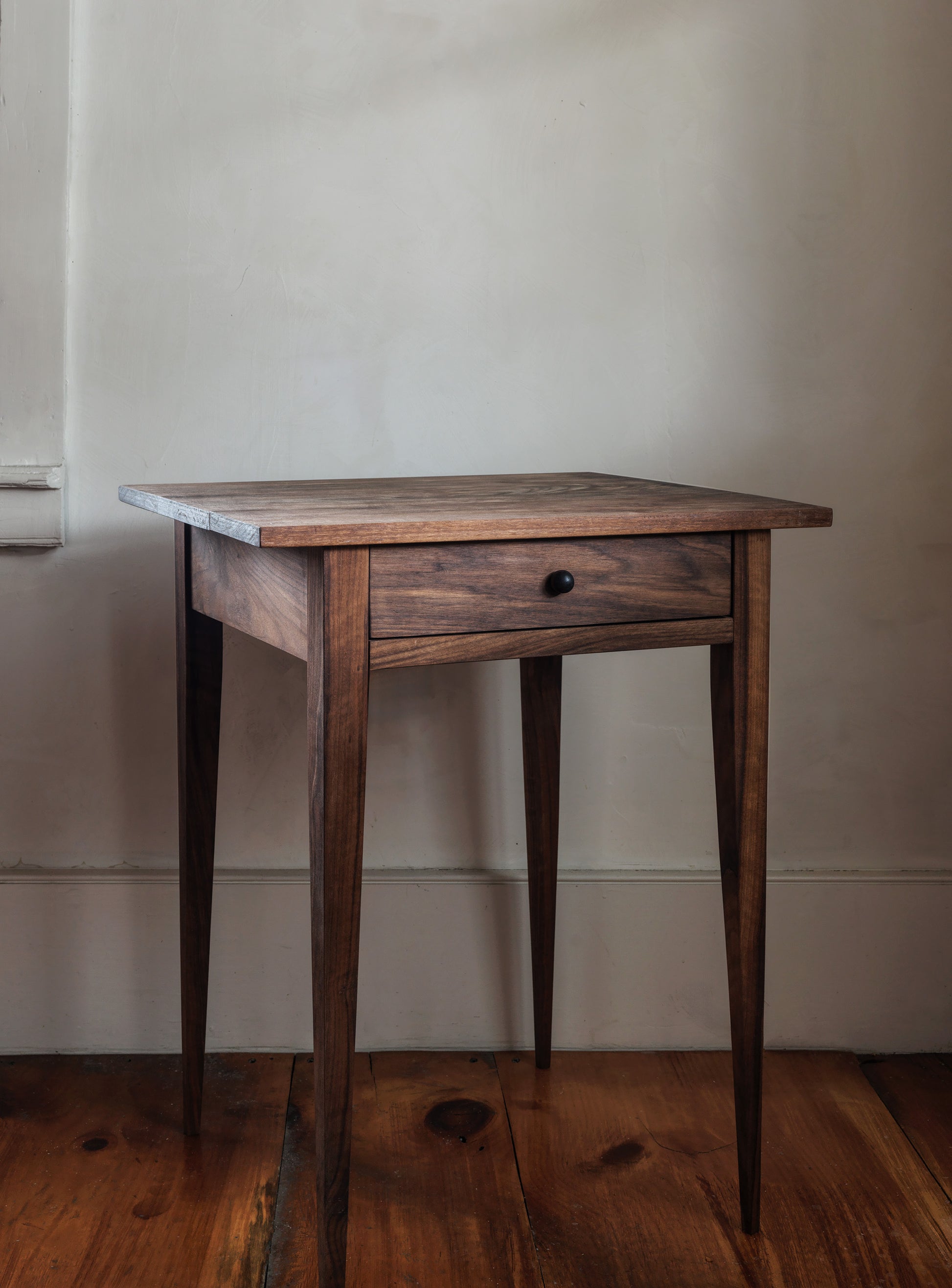 The Shakers believed that furniture should be honest and not deceitful—no veneers or unnecessary ornamentation. Our nightstand honors this philosophy with the austere design and delicate proportions found in many of their late eighteenth-century side tables. Made from solid American cherry or walnut, the table features a twenty-by-seventeen-inch tabletop with a utilitarian rabbeted drawer. It's hand-rubbed with the same raw linseed oil we use on our bed, resulting in zero VOCs and a finish that becomes richer and darker over time. Please note: the  traditional drawer assembly does not utilize contemporary glides - expect more friction and stiffness when opening the drawer.