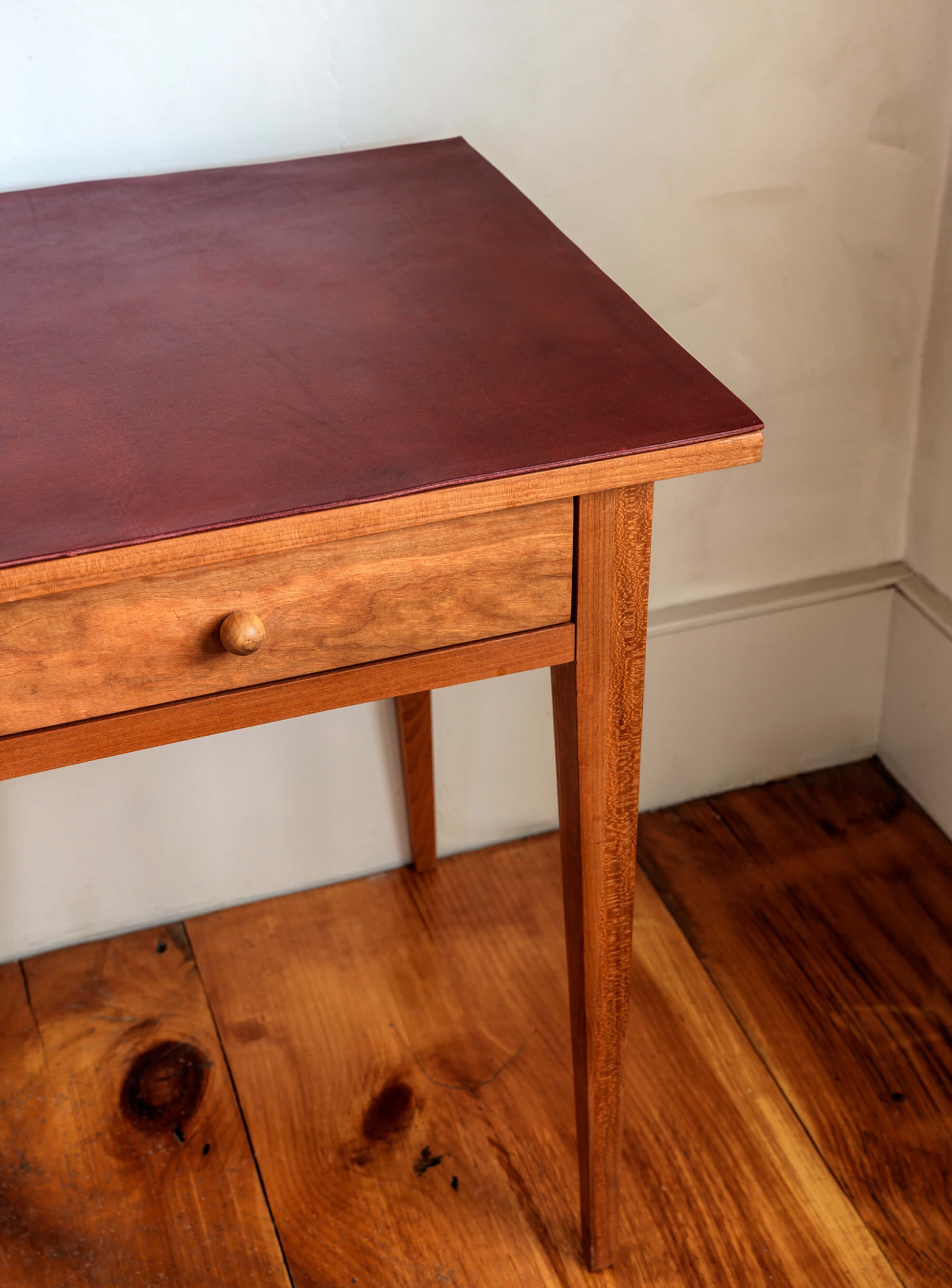 Made by Billy Kirk in Jersey City, NJ, from American hides, the optional leather top is a rich red, protecting the lightly finished wood from water rings and dings. It sits on top of the table like a large coaster, with no adhesive.