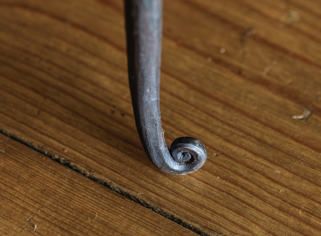 With frequent handling, the steels surface will lighten on the frequently contacted points and remain dark in the recesses. This gradual patina is akin to an old handrail or well-used tool, growing richer over time.