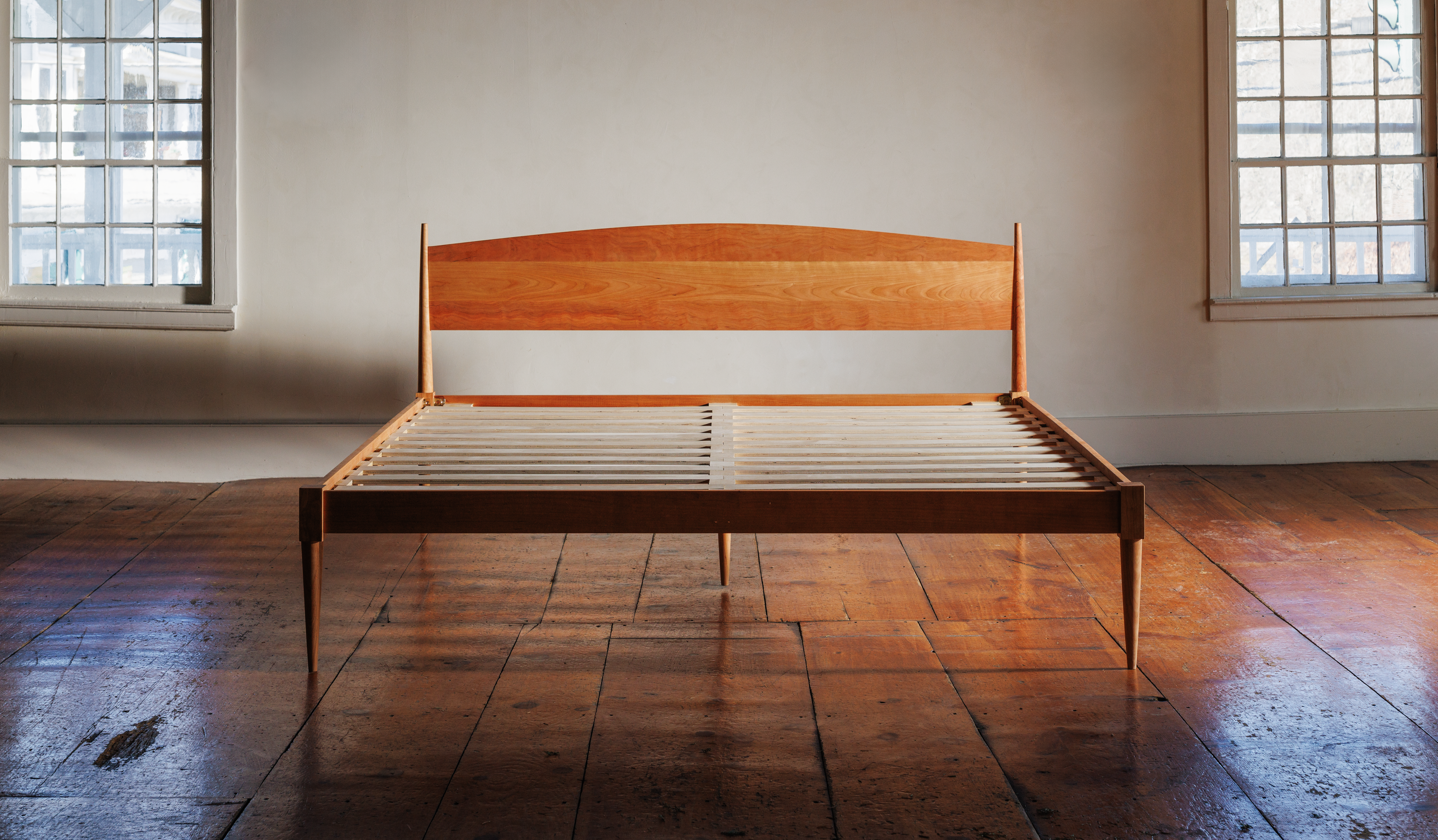 Inspired by the sparse beauty of Shaker dormitories at Hancock Village, MA, our bed is crafted from solid American Cherry or Black Walnut. The design philosophy is slow and sturdy, with single-stave rails and posts, and a ¾-inch-thick headboard made from three carefully selected boards.